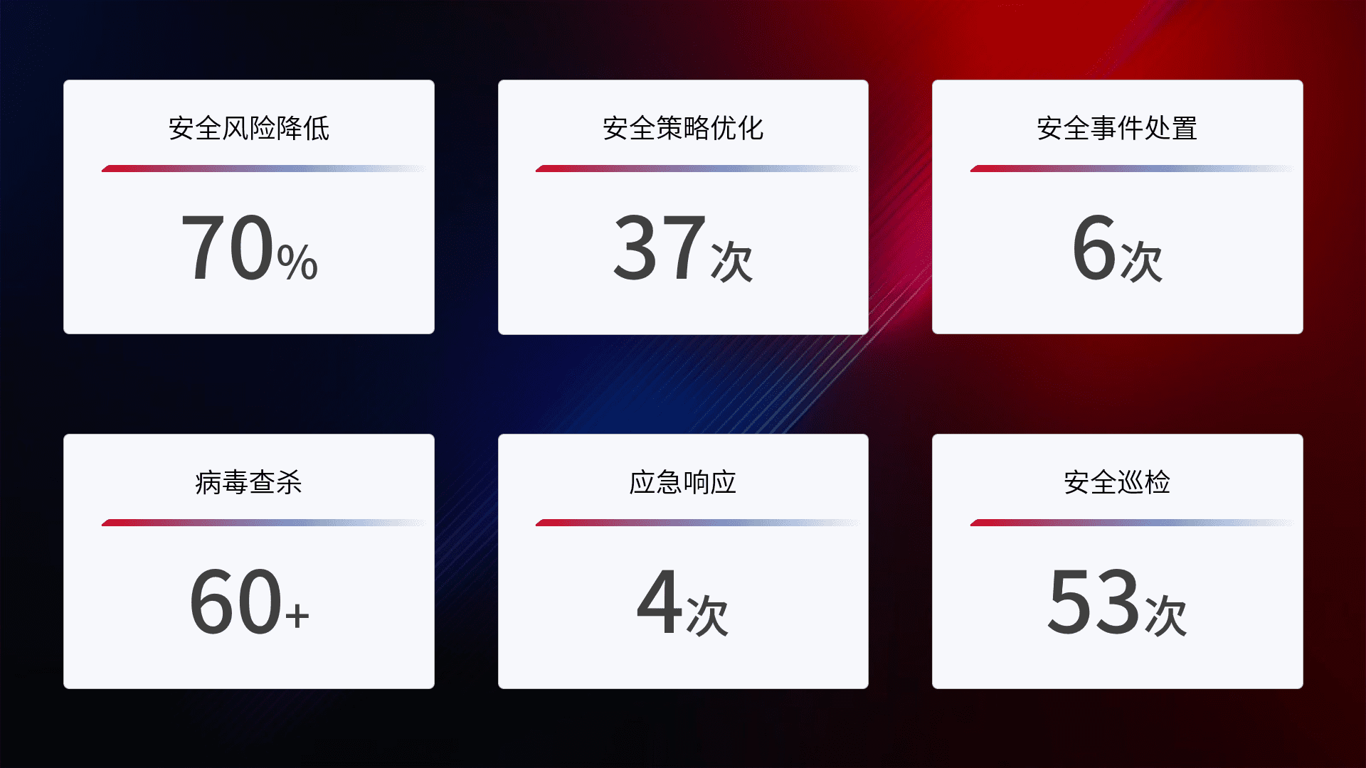 提供全面的安全事件报告体系,,包括处置报告、、、周报、、、、季度和年度总结,,结合持续监控,,,帮助客户深入了解网络安全状况。。。。