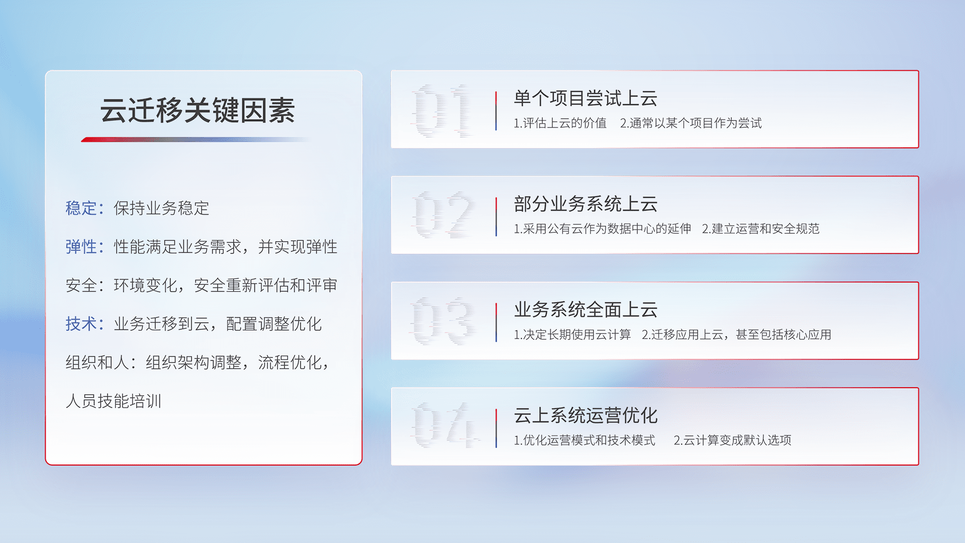 结合实际业务,,,,从规划设计、、云平台选型、、云原生改造、、、、数据迁移、、集成交付,,,,迁移全过程为客户识别最佳上云路径,,,做好风险识别管理,,设计网络架构、、身份权限、、安全审计合规、、操作审计、、、、日志审计、、监控告警策略、、、多站点容灾设计等,,,对云上基础设施进行整体规划,,,,提升IT治理水平,,,,以满足弹性、、、高可用、、、高性能的需求。。。。